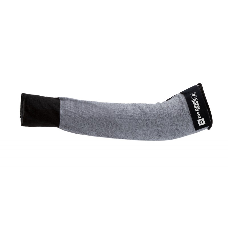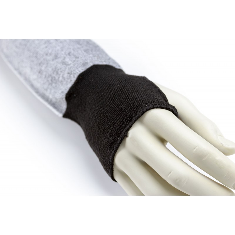 Manchette grise tricotée sans couture, à base de fibres HDPA, polyester, élasthanne, jauge 13, ajustement par scratch en haut du bras, forme anatomique de la main en tricot extra fin, avec passage pouce, ambidextre. Longueur : 450mm 1 pièce