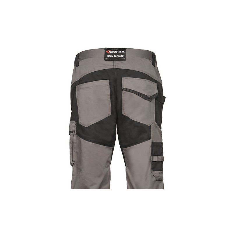 Double poche postérieure dont une avec patte et fermeture velcro, élastique intérieur à la taille, entrejambe et partie postérieure en tissu élastique pour une plus grande liberté de mouvement, insert au genou en tissu côtelé strecht pour une grande flexibilité de mouvement, inserts réfléchissants, jambes et genoux à coupe ergonomique, passant porte-marteau, poche latérale à double ouverture (fermeture avec velcro et zip), poche pour mètre pliant, poches larges à l’avant