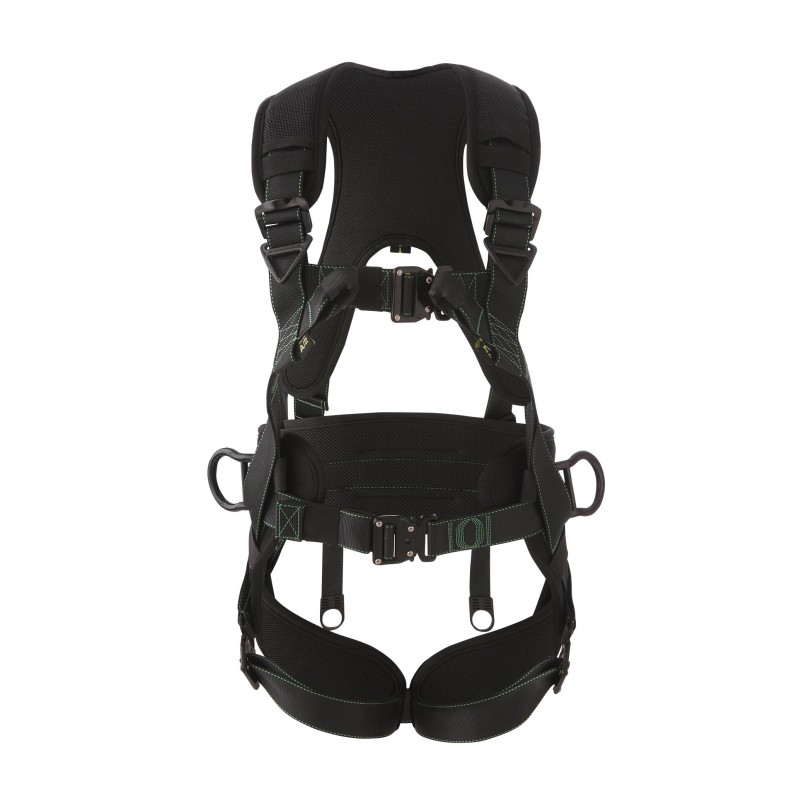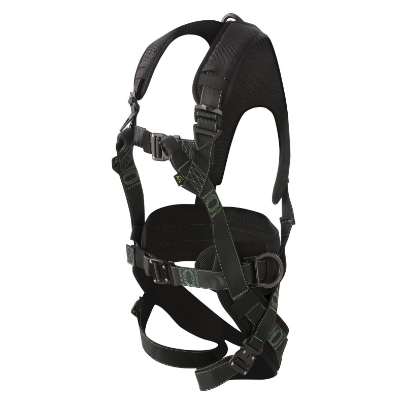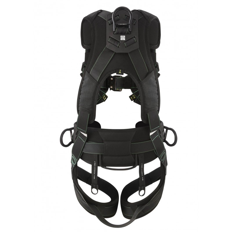 Le kit est constitué d'un harnais, d'un dispositif rétractable avec absorbeur de 2 m, d'une sangle d'ancrage et de deux connecteurs